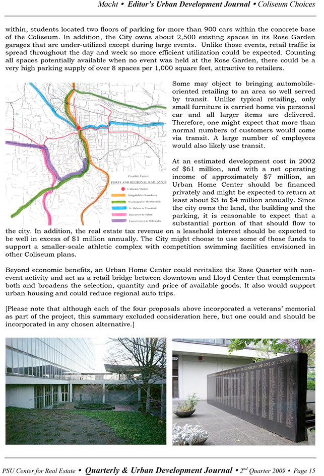 William Macht has taught real estate development and planning at Portland State University for over 28 years as well as a development consultant for the past 30 years. This report, which Macht wrote, looks at the variety of uses that have been proposed for Veterans Memorial Coliseum, as well as its underlying development agreement (in which the Portland Trail Blazers, through Portland Arena Management, are allowed to manage and operate the city-owned Coliseum in tandem with the team-owned Moda Center arena next door. Macht has long argued that the management agreement creates a financial incentive for the Coliseum’s managers to take the arena to just short of the break-even point that would trigger routine maintenance.