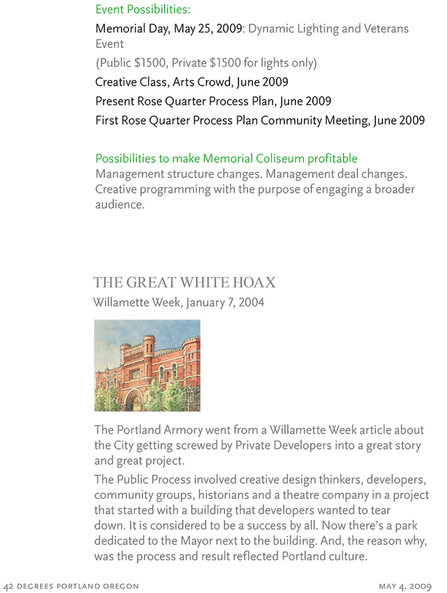 This is the handout that the Friends (then known as '42 degrees') distributed to the City Council on May 24, 2009. We were trying to get across the point that saving Memorial Coliseum was a bold move that could attract national attention and help bring on a rejuvenation of the Rose Quarter.