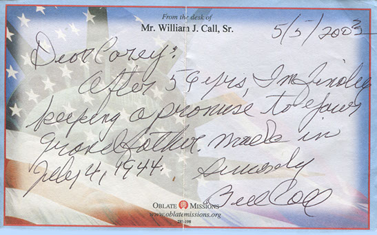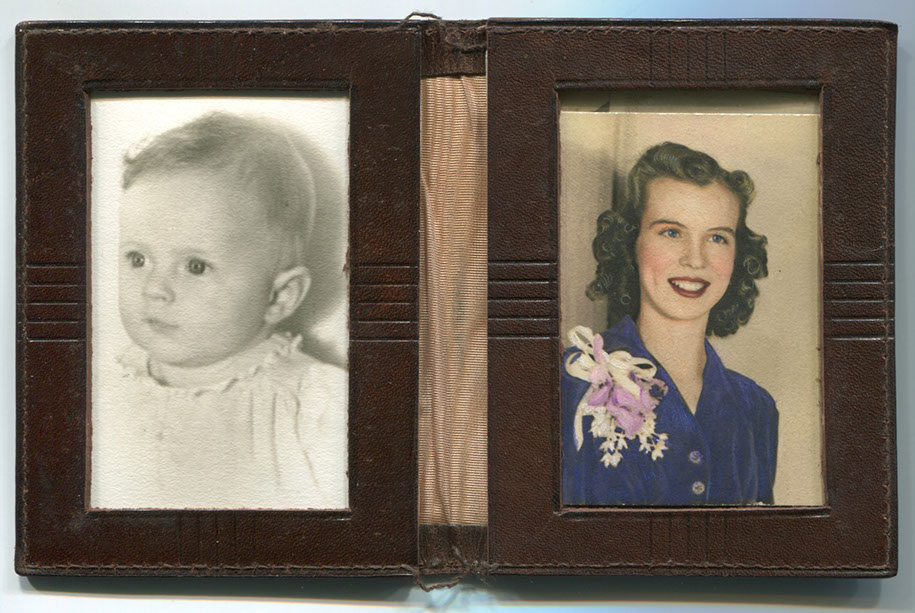 After 4 years of searching for WWII veterans who were in the 82nd Airborne/508th Infantry, Harold Brogan's grandson Corey found one of the sargeants who was in Harold's platoon, William Call. Call was with Harold when he died. Corey interviewed him in 2003. A couple of weeks after the interview, Corey received a small packet in the mail. The items were wrapped in a very thin leather pouch which Harold carried inside his jacket, near his heart that carried photographs of Harold Brogan's wife June, his daughter Sharon, and other family members.