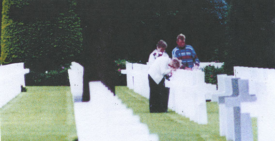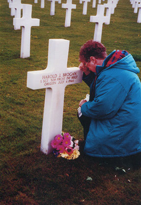 1994, the 50th anniversary of the Battle of Normandy and Harold Brogan's death, June and Sharon visit Harold's gravesite for the first time. "The man in this photo seemed to appear out of nowhere. He came to Mother, put his hands on her shoulders, embraced her, kissed her on both cheeks and said, 'I thank you and my country thanks you for your great sacrifice.' He said he was a monk with a group from Belgium. Mother felt he was her angel. It was the first time anyone had ever publicly thanked her."