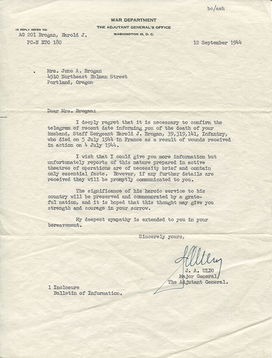 Army letter to Harold's mother Mary Brogan informing of internment of remains of Harold J. Brogan at the U.S. Military Cemetery. St. Laurent, France.