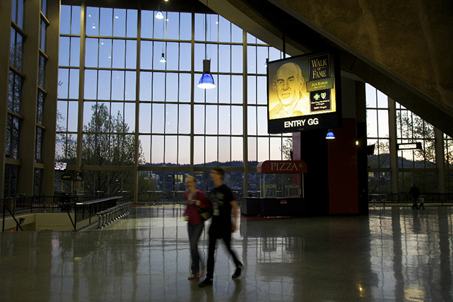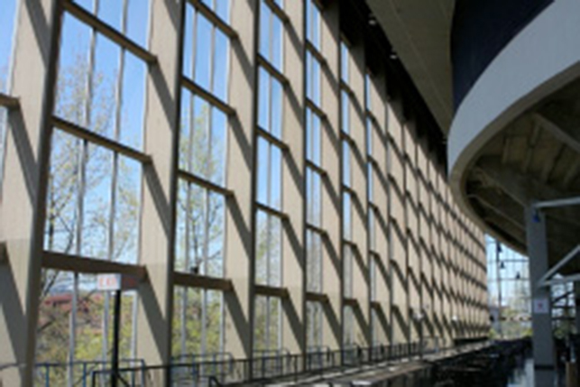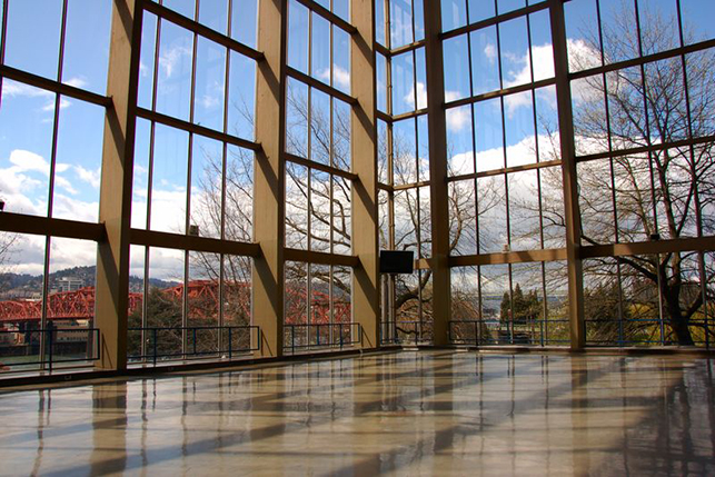 Experiencing Veteran’s Memorial Coliseum isn’t just about what’s happening inside the arena. The Coliseum's Concourse is a space with a curving concrete arena on one side and four huge 360 foot long, 50 foot high walls of glass that allow visitors to look out onto the Willamette River and the downtown Portland skyline.