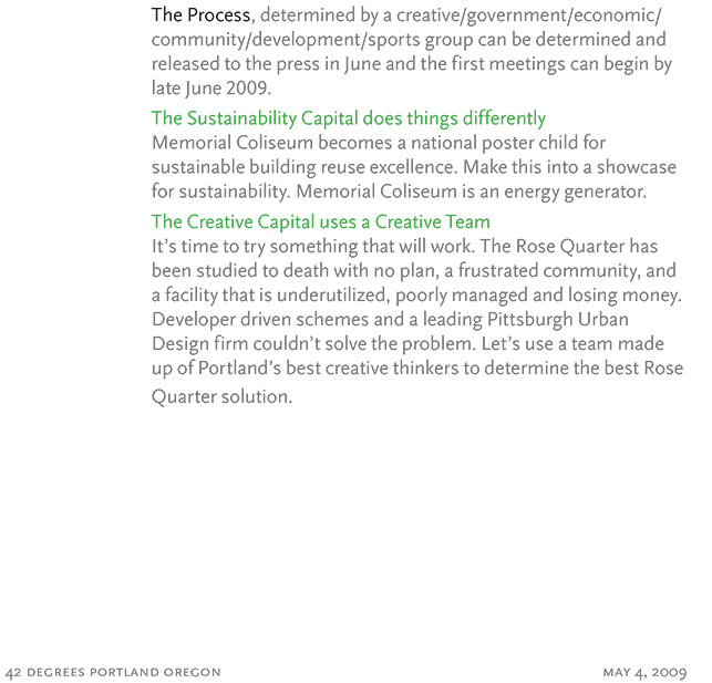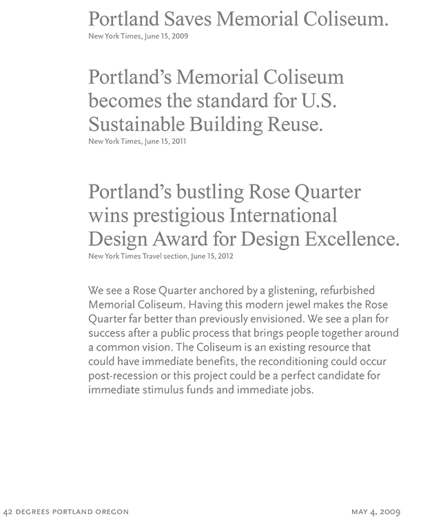 This is the handout that the Friends (then known as '42 degrees') distributed to the City Council on May 24, 2009. We were trying to get across the point that saving Memorial Coliseum was a bold move that could attract national attention and help bring on a rejuvenation of the Rose Quarter.