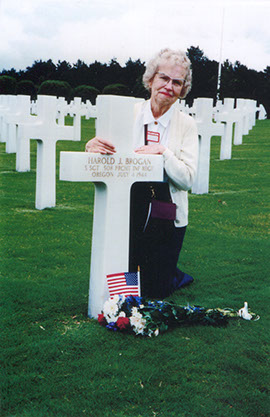 1994, the 50th anniversary of the Battle of Normandy and Harold Brogan's death, June and Sharon visit Harold's gravesite for the first time. "The man in this photo seemed to appear out of nowhere. He came to Mother, put his hands on her shoulders, embraced her, kissed her on both cheeks and said, 'I thank you and my country thanks you for your great sacrifice.' He said he was a monk with a group from Belgium. Mother felt he was her angel. It was the first time anyone had ever publicly thanked her."