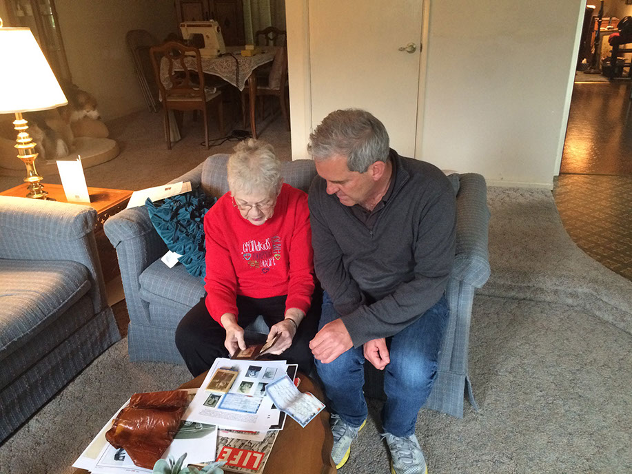 Sharon Brogan Kearsley, Harold Brogan's daughter, and Stuart Emmons looking at photographs of Harold Brogan and his family.