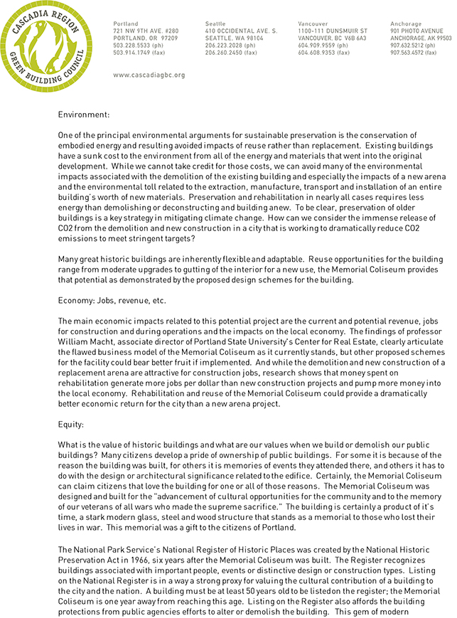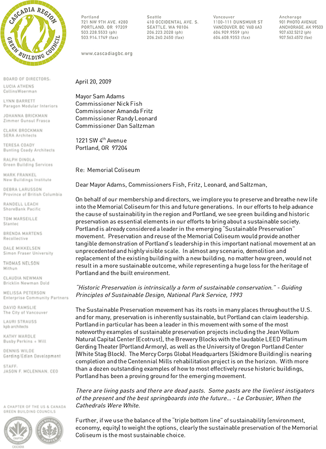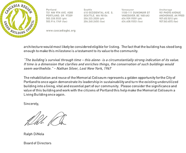 “The rehabilitation and reuse of the Memorial Coliseum represents a golden opportunity for the City of Portland to once again demonstrate its leadership in sustainability,” writes Cascadia Green Building Council board member Ralph DiNola in a letter to the mayor, “and to turn the existing underutilized building into a living, vital and essential part of our community.” The full letter is to the left.